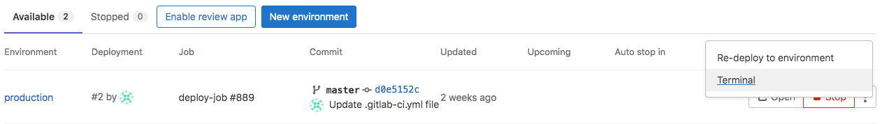 stages: - build - test - deploy ... deploy_review: stage: deploy environment: name: review/$CI_COMMIT_REF_SLUG url: https://$CI_ENVIRONMENT_SLUG.example.com on_stop: stop_review stop_review: stage: deploy environment: name: review/$CI_COMMIT_REF_SLUG action: stop when: manualAdd a